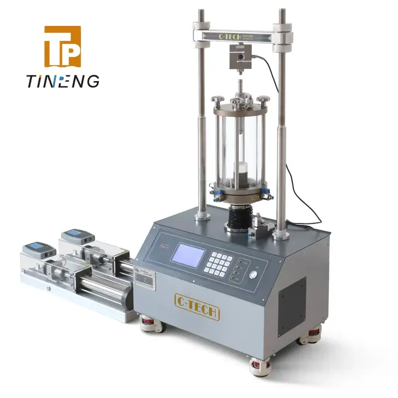 Triaxial Loading Frame: Rangka uji kaku, tahan lama, operasi halus, dengan stepper motor dan sensor gaya & perpindahan presisi tinggi. Dilengkapi proteksi beban berlebih.