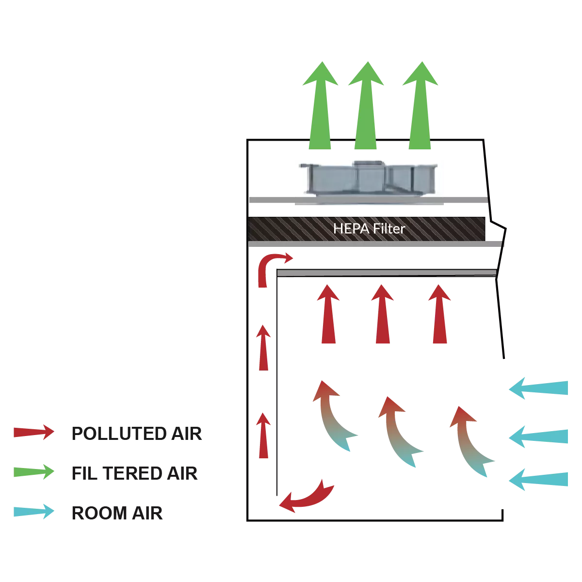 Dinding Belakang Area Kerja Berlubang (Perforated Back Wall):Â Desain khusus ini menstabilkan aliran udara, menghilangkan turbulensi, dan mencegah terbentuknya sudut mati (dead air corners), memastikan distribusi udara yang seragam.